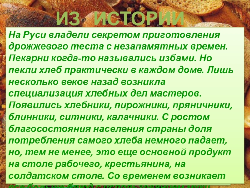 На Руси владели секретом приготовления дрожжевого теста с незапамятных времен. Пекарни когда-то назывались избами. Но пекли хлеб практически в каждом доме. Лишь несколько веков назад возникла специализация хлебных дел мастеров. Появились хлебники, пирожники, пряничники, блинники, ситники, калачники. С ростом благосостояния населения страны доля потребления самого хлеба немного падает, но, тем не менее, это еще основной продукт на столе рабочего, крестьянина, на солдатском столе. Со временем возникает все больше блюд с использованием муки.