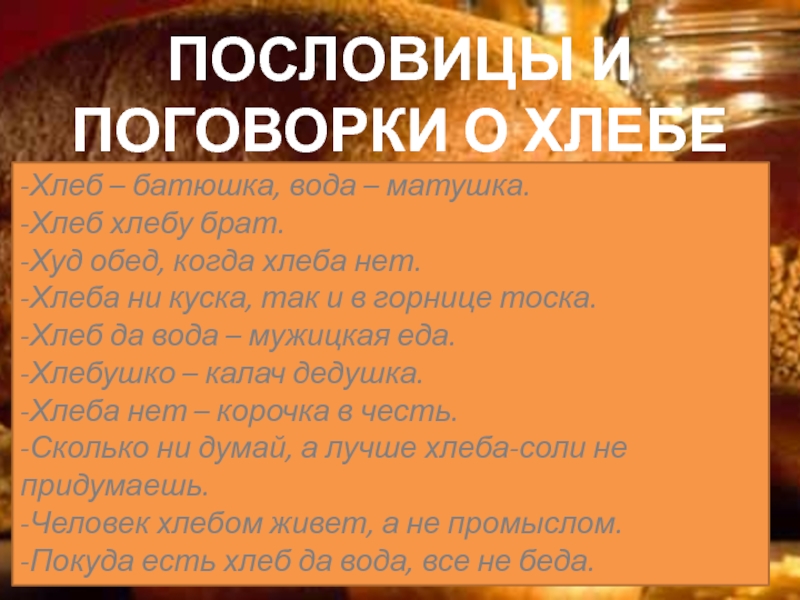 Слайд 9ПОСЛОВИЦЫ И ПОГОВОРКИ О ХЛЕБЕ