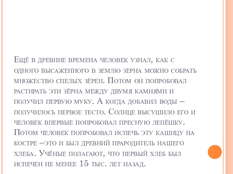 землю зерна можно собрать множество спелых зёрен. Потом он попробовал растирать эти зёрна между двумя камнями и получил первую муку. А когда добавил воды – получилось первое тесто. Солнце высушило его и человек впервые попробовал пресную лепёшку. Потом человек попробовал испечь эту кашицу на костре –это и был древний прародитель нашего хлеба. Учёные полагают, что первый хлеб был испечен не менее 15 тыс. лет назад.