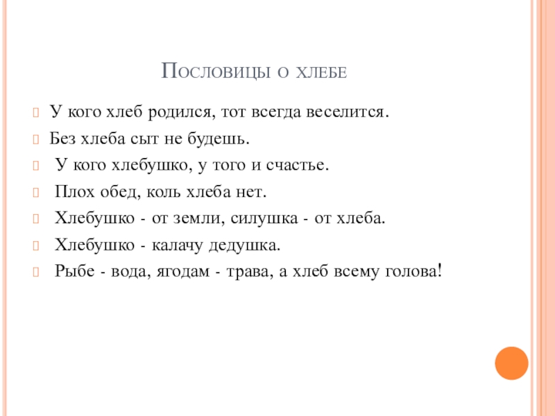 Пословицы о хлебеУ кого хлеб родился, тот всегда веселится.Без хлеба сыт не будешь. У кого хлебушко, у