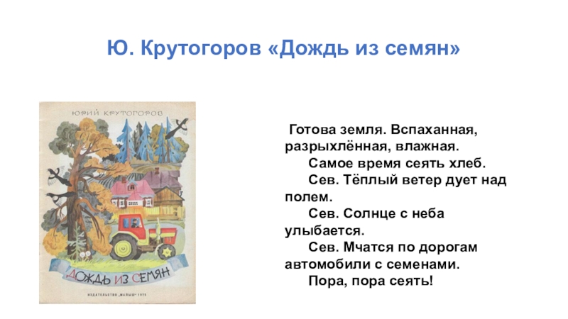 Ю. Крутогоров «Дождь из семян» Готова земля. Вспаханная, разрыхлённая, влажная.    Самое время сеять хлеб.