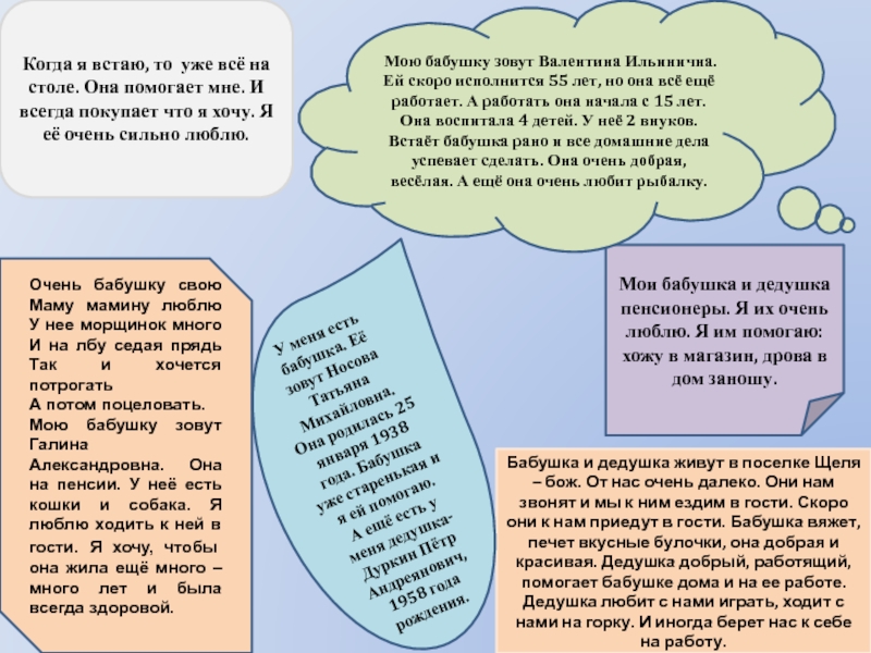 Бабушка и дедушка живут в поселке Щеля – бож. От нас очень далеко. Они нам звонят и мы к ним ездим в гости. Скоро они к нам приедут в гости. Бабушка вяжет, печет вкусные булочки, она добрая и красивая. Дедушка добрый, работящий, помогает бабушке дома и на ее работе. Дедушка любит с нами играть, ходит с нами на горку. И иногда берет нас к себе на работу.