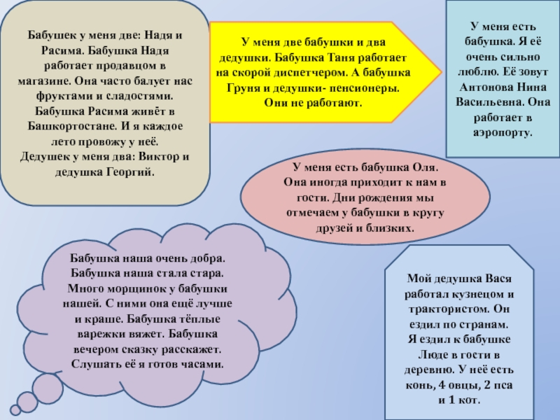 У меня есть бабушка Оля. Она иногда приходит к нам в гости. Дни рождения мы отмечаем у бабушки в кругу друзей и близких.