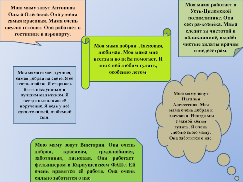 Мою маму зовут Антонова Ольга Олеговна. Она у меня самая красивая. Мама очень вкусно готовит. Она работает в гостинице в аэропорту.