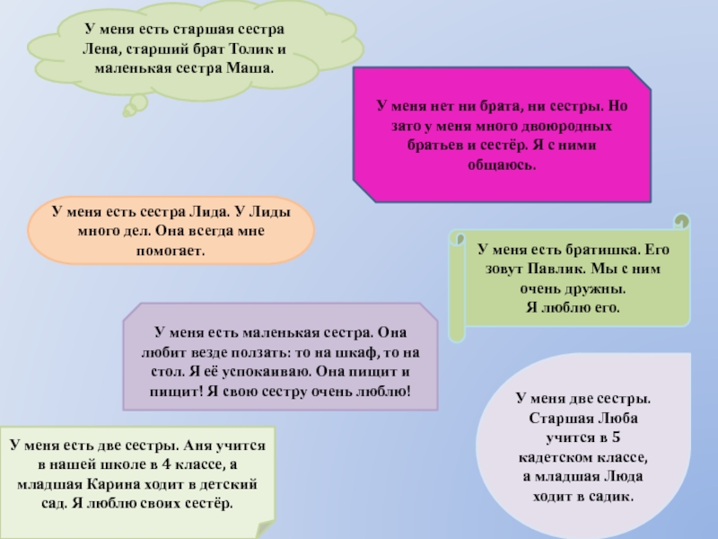У меня есть старшая сестра Лена, старший брат Толик и маленькая сестра Маша.