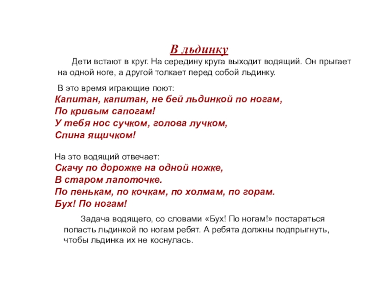 Задача водящего, со словами «Бух! По ногам!» постараться попасть льдинкой по ногам ребят. А ребята должны подпрыгнуть, чтобы льдинка их не коснулась.