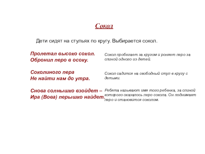 Дети сидят на стульях по кругу. Выбирается сокол.