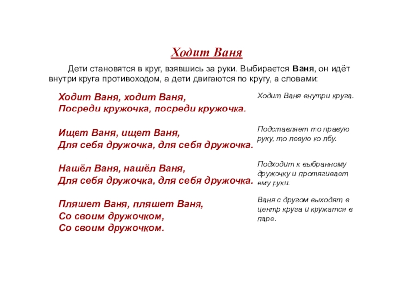 Дети становятся в круг, взявшись за руки. Выбирается Ваня, он идёт внутри круга противоходом, а дети двигаются по кругу, а словами: