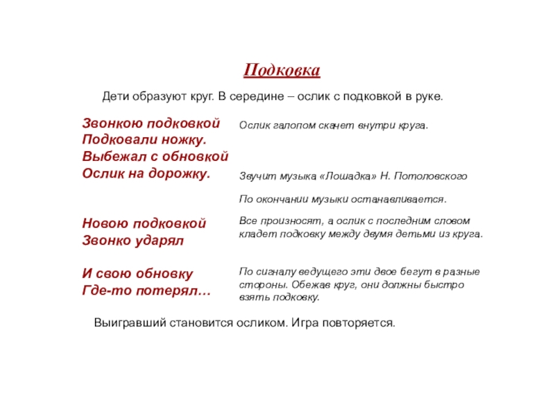Все произносят, а ослик с последним словом кладет подковку между двумя детьми из круга.