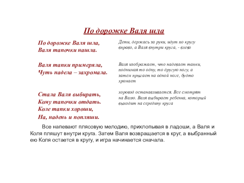 Все напевают плясовую мелодию, прихлопывая в ладоши, а Валя и Коля пляшут внутри круга. Затем Валя возвращается в круг, а выбранный ею Коля остается в кругу, и игра начинается сначала.