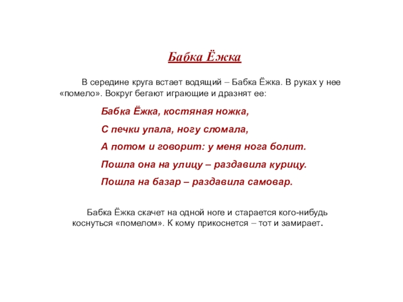 В середине круга встает водящий – Бабка Ёжка. В руках у нее «помело». Вокруг бегают играющие и дразнят ее: