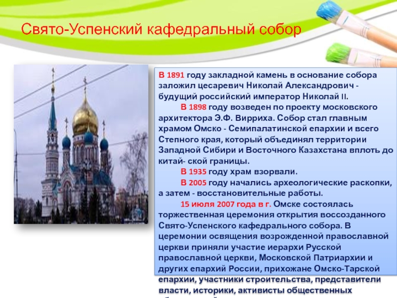 В 1898 году возведен по проекту московского архитектора Э.Ф. Вирриха. Собор стал главным храмом Омско - Семипалатинской епархии и всего Степного края, который объединял территории Западной Сибири и Восточного Казахстана вплоть до китай- ской границы.