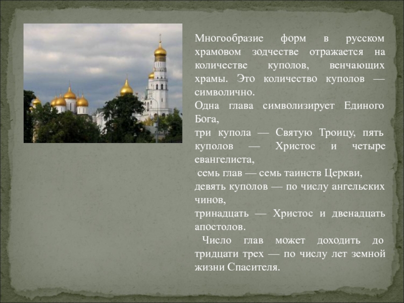 Над храмом возвышается купол, символизирующий небо. Купол венчается главою, на которой ставится крест, во славу главы Церкви – Господа Иисуса Христа.