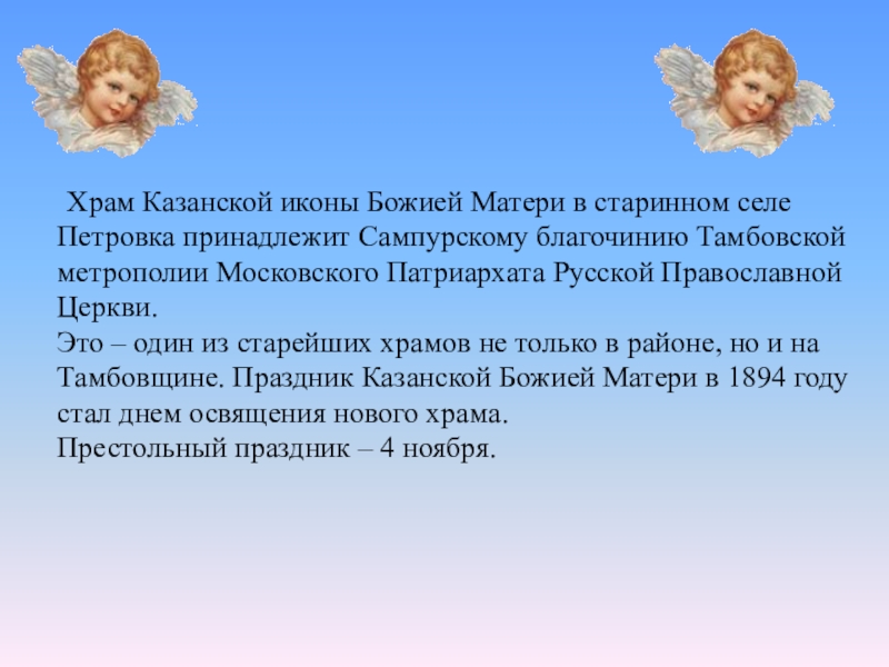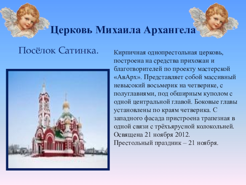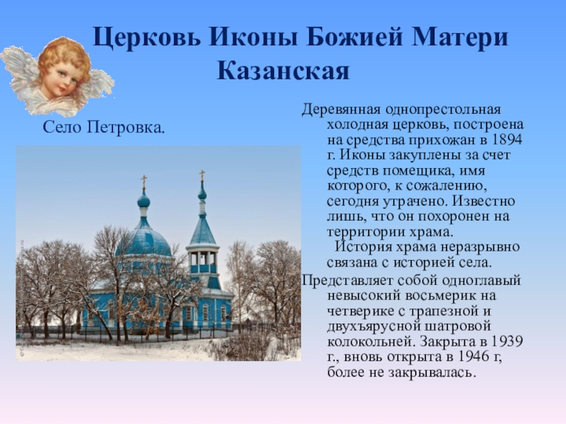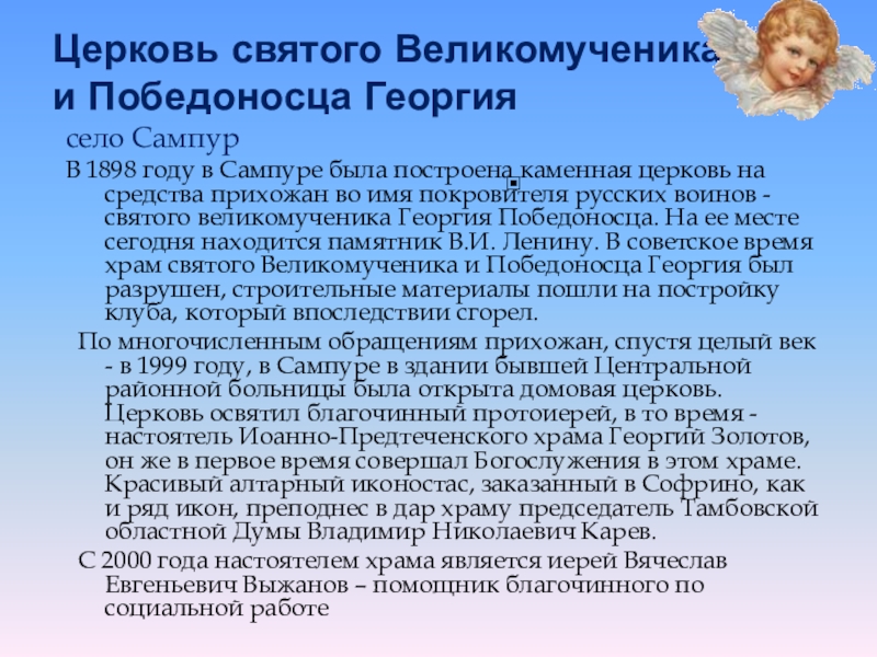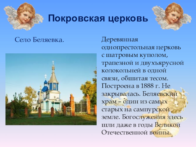 Кирпичная одноглавая однопрестольная церковь - куб, перекрытый восьмигранным куполом, и притвор с запада, над которым возвышается двухъярусная колокольня с шатровой крышей. Построена в 2005-2006 гг. тщанием председателя Тамбовской областной думы нескольких созывов Карева В. Н., уроженца села, и других жертвователей Храм построен на месте разрушенной деревянной церкви, построенной в 1840 году на средства прихожан. Ее штат состоял из двух священников, диакона и двух псаломщиков. Храм был уничтожен в 1936 году.