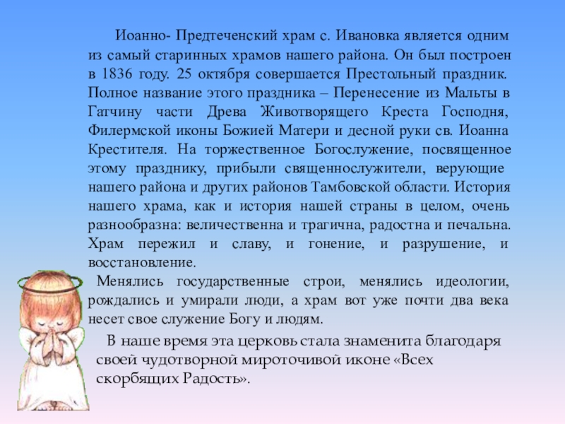 В наше время эта церковь стала знаменита благодаря своей чудотворной мироточивой иконе «Всех скорбящих Радость».