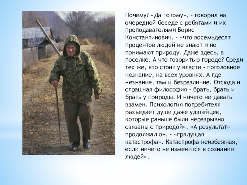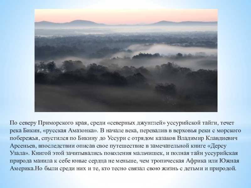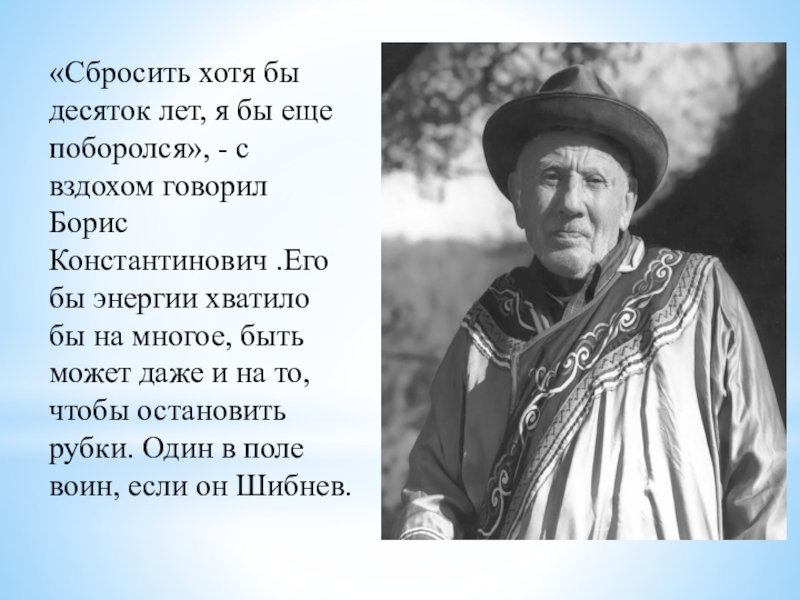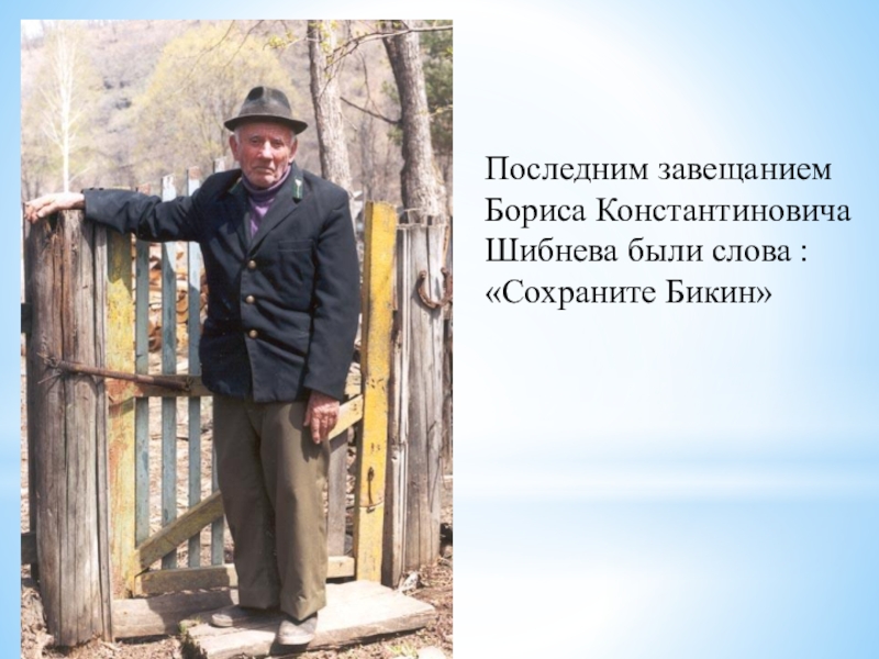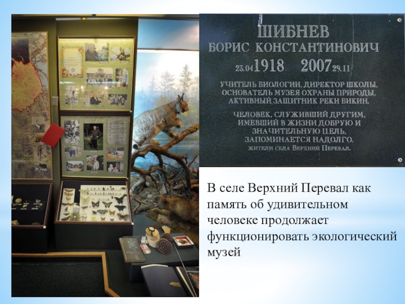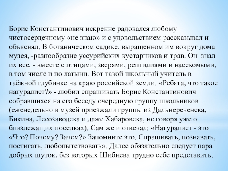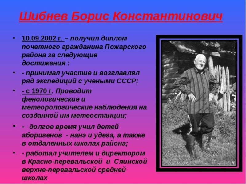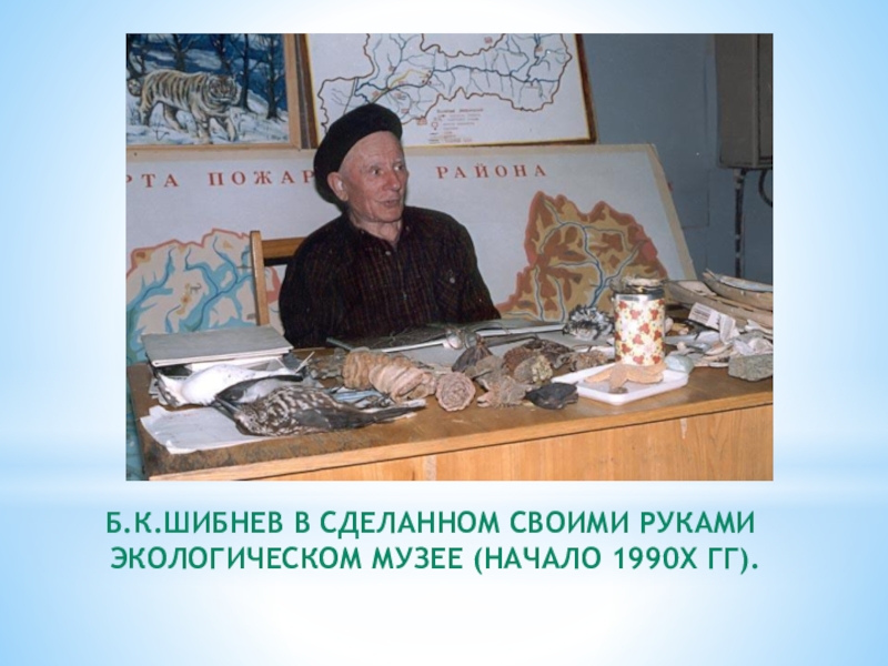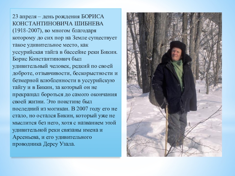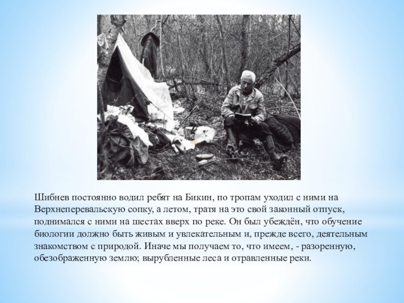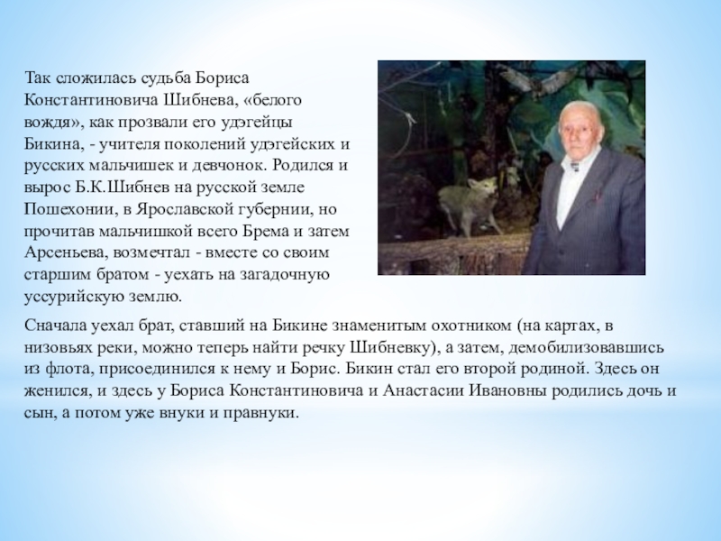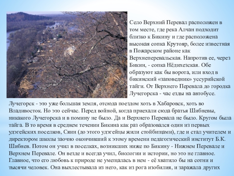 Лучегорск - это уже большая земля, отсюда поездом хоть в Хабаровск, хоть во Владивосток. Но это сейчас. Перед войной, когда приехали сюда братья Шибневы, никакого Лучегорска и в помину не было. Да и Верхнего Перевала не было. Кругом была тайга. В то время в среднем течении Бикина как раз образовался один из первых удэгейских поселков, Сяин (до этого удэгейцы жили стойбищами), где и стал учителем и директором школы заочно окончивший к этому времени педагогический институт Б.К.Шибнев. Потом он учил в поселках, возникших ниже по Бикину - Нижнем Перевале и Верхнем Перевале. Он везде и всегда учил, биологии и истории, но это не главное. Главное, что его любовь к природе не умещалась в нем - её хватило бы на сотни и тысячи человек. Она выхлестывала из него, как из рога изобилия, и заражала других