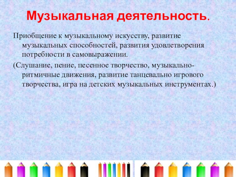 Формирование интереса к эстетической стороне окружающей действительности, удовлетворение потребности детей в самовыражении, развитии музыкальности, способности эмоционально воспринимать музыку