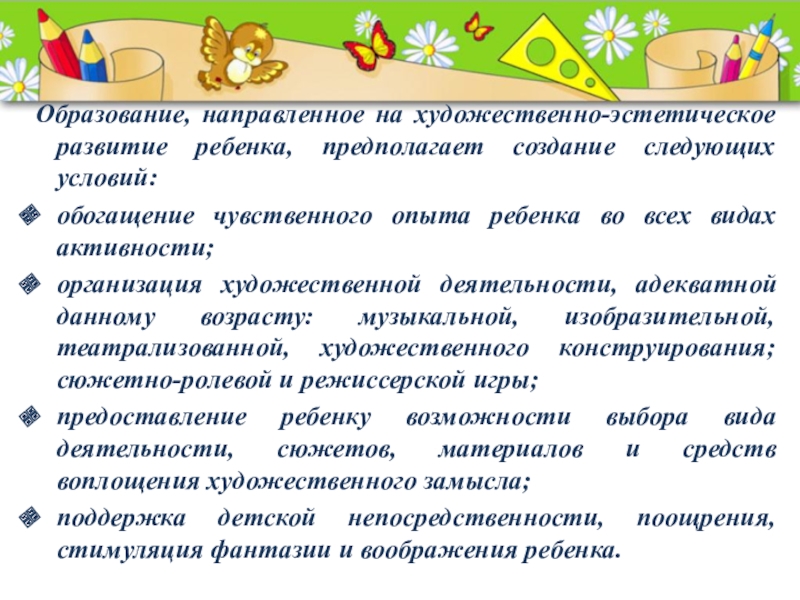 Слайд 6 Образование, направленное на художественно-эстетическое развитие ребенка, предполагает создание следующих условий:
