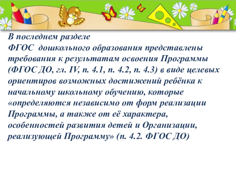 Слайд 11В последнем разделе ФГОС дошкольного образования представлены требования к результатам освоения Программы