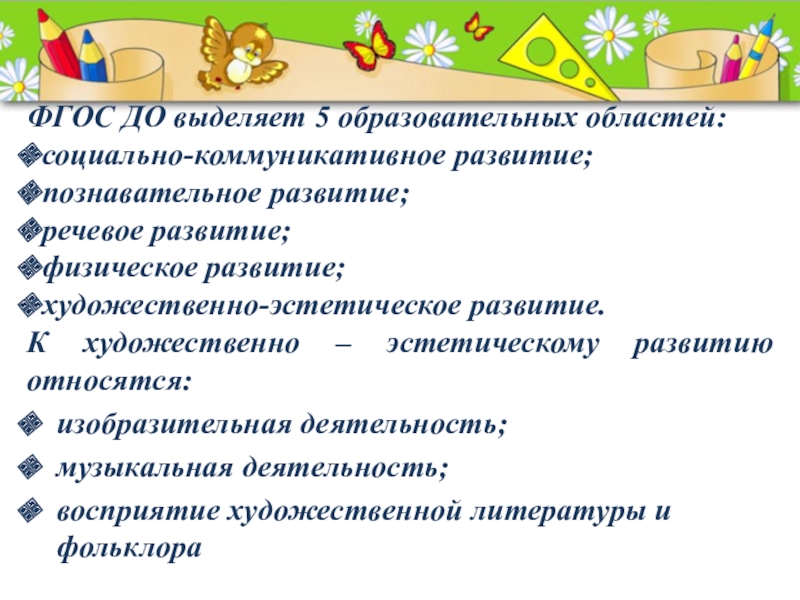Слайд 9ФГОС ДО выделяет 5 образовательных областей: