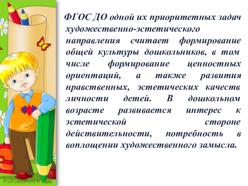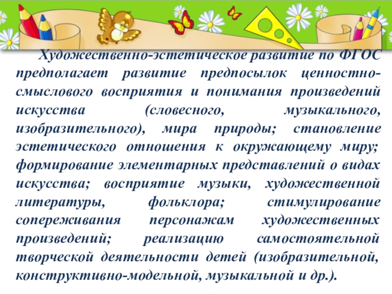 Слайд 2 Художественно-эстетическое развитие по ФГОС предполагает развитие предпосылок ценностно-смыслового