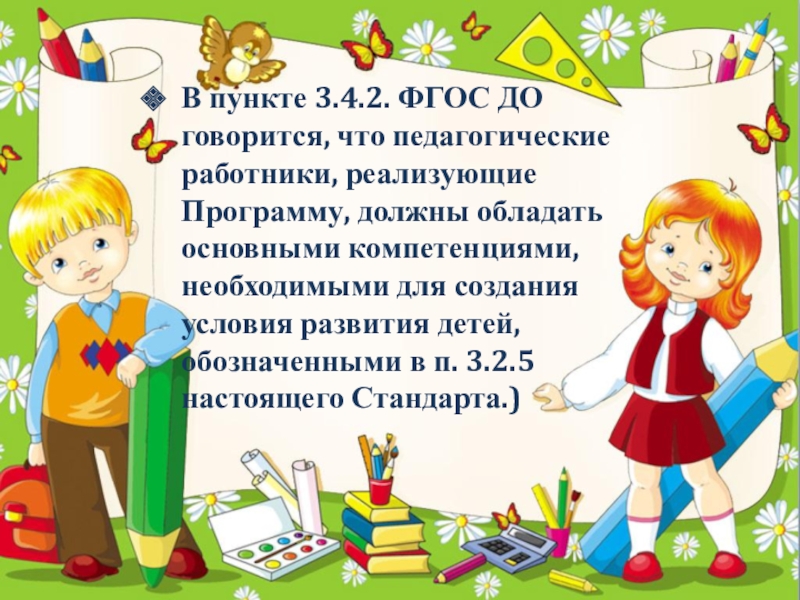 обладать основными компетенциями, необходимыми для создания условия развития детей, обозначенными в п. 3.2.5 настоящего Стандарта.)
