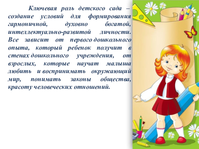 формирования гармоничной, духовно богатой, интеллектуально-развитой личности. Все зависит от первого дошкольного опыта, который ребенок получит в стенах дошкольного учреждения, от взрослых, которые научат малыша любить и воспринимать окружающий мир, понимать законы общества, красоту человеческих отношений.