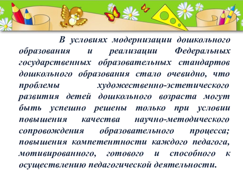 реализации Федеральных государственных образовательных стандартов дошкольного образования стало очевидно, что проблемы художественно-эстетического развития детей дошкольного возраста могут быть успешно решены только при условии повышения качества научно-методического сопровождения образовательного процесса; повышения компетентности каждого педагога, мотивированного, готового и способного к осуществлению педагогической деятельности.