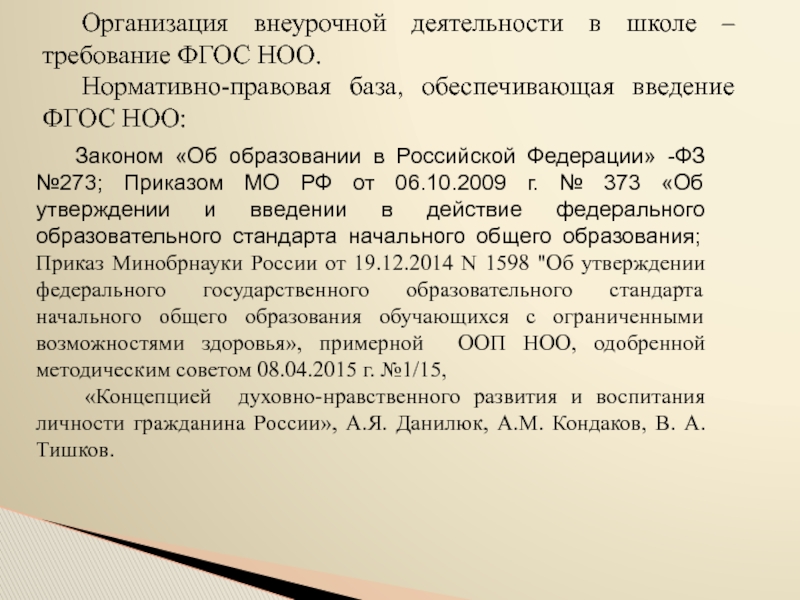 Законом «Об образовании в Российской Федерации» -ФЗ №273; Приказом МО РФ от 06.10.2009 г. № 373 «Об утверждении и введении в действие федерального образовательного стандарта начального общего образования; Приказ Минобрнауки России от 19.12.2014 N 1598 "Об утверждении федерального государственного образовательного стандарта начального общего образования обучающихся с ограниченными возможностями здоровья», примерной ООП НОО, одобренной методическим советом 08.04.2015 г. №1/15,