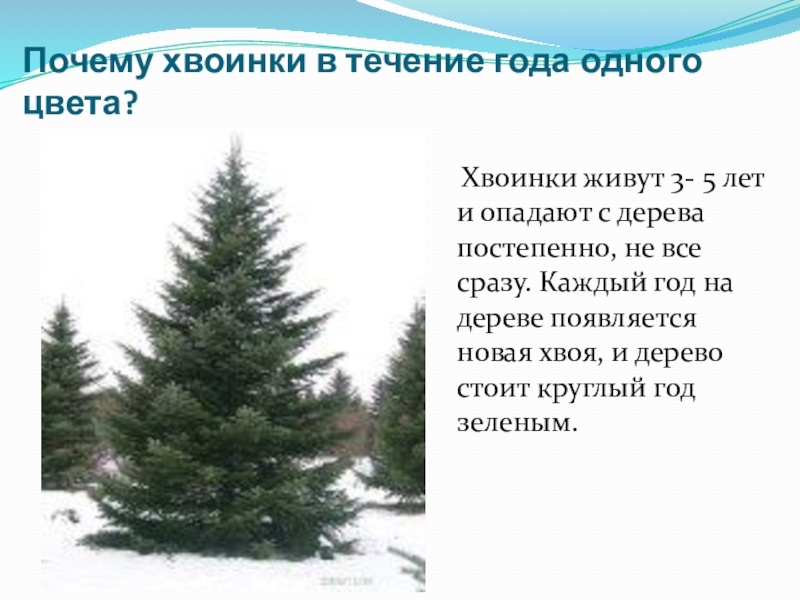 Почему хвоинки в течение года одного цвета?  Хвоинки живут 3- 5 лет и опадают с дерева