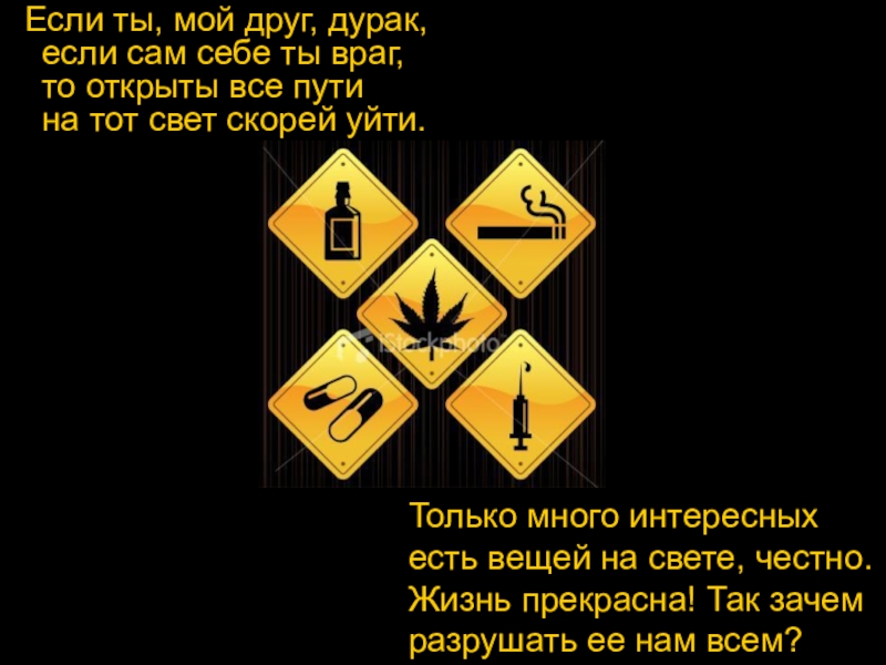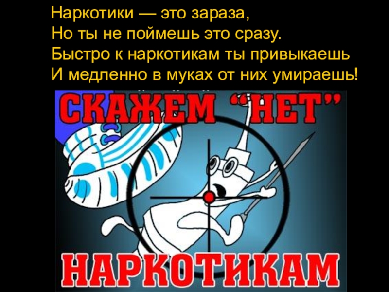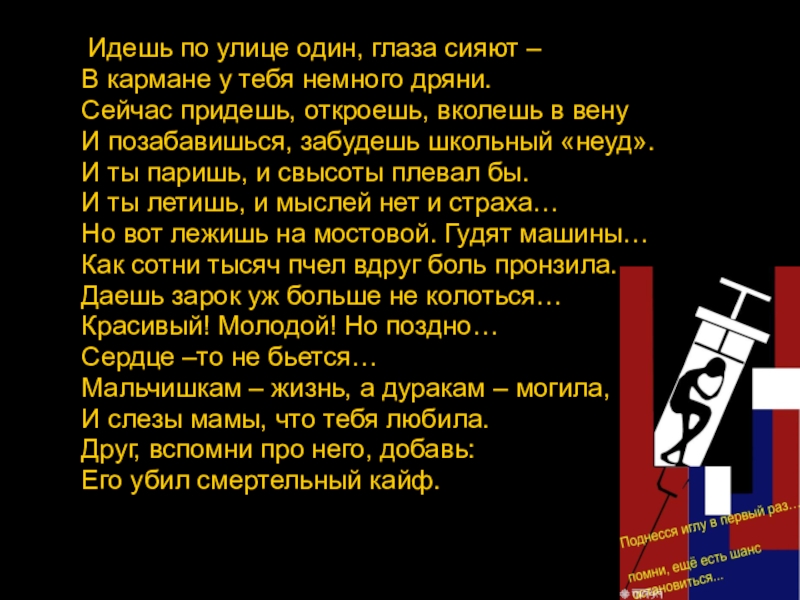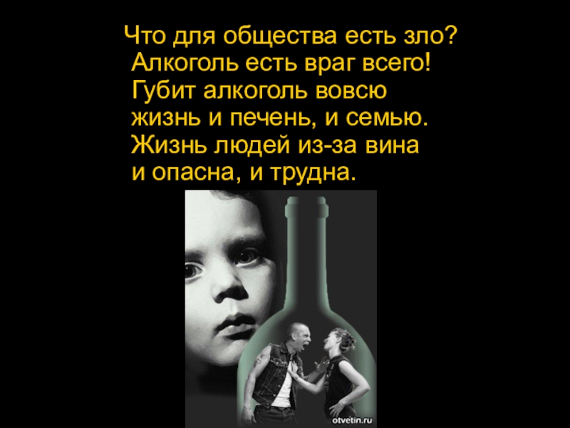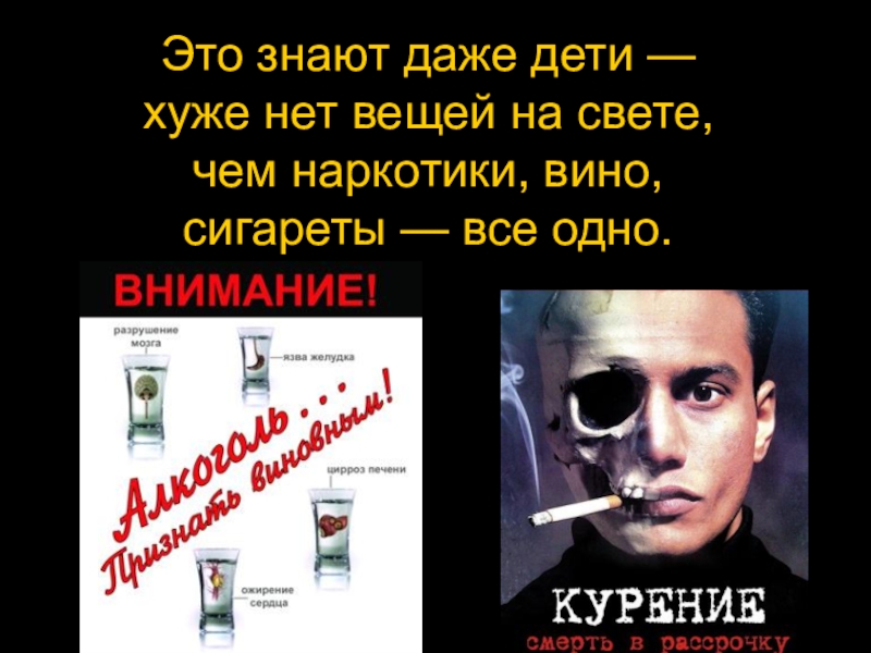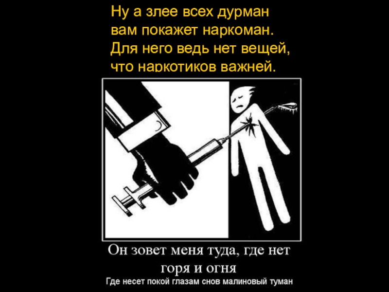 социальному падению человека. Как наркомания, так и алкоголизм, способны в два счета загубить жизнь любого человека, имеющего подобные вредные привычки. Человек просто перестает быть собой, все его желания основываются на том, чтобы добыть себе очередную дозу, без которой он уже не может существовать. Это уже не человек, это животное, удовлетворяющее лишь свои потребности.