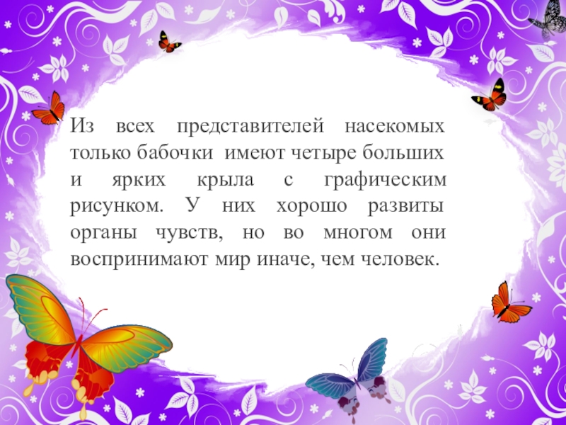 Слайд 6Из всех представителей насекомых только бабочки имеют четыре больших и ярких