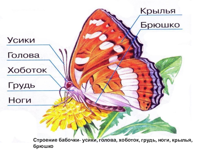 Слайд 8Строение бабочки- усики, голова, хоботок, грудь, ноги, крылья, брюшко