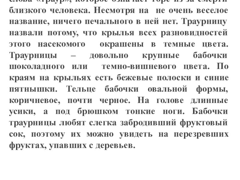Слайд 20Траурница- имя бабочки происходит от русского слова «траур», которое означает горе