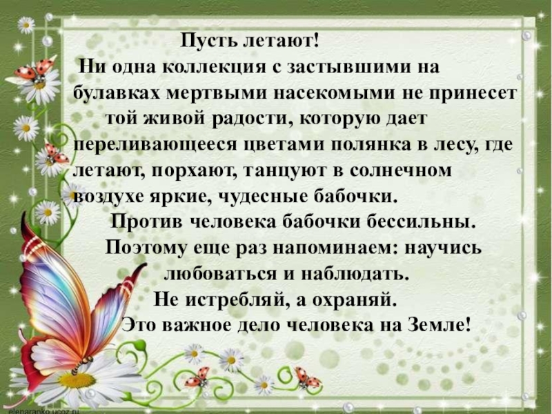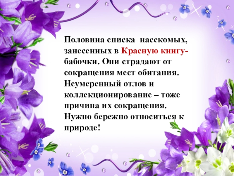Слайд 4Половина списка насекомых, занесенных в Красную книгу- бабочки. Они страдают от