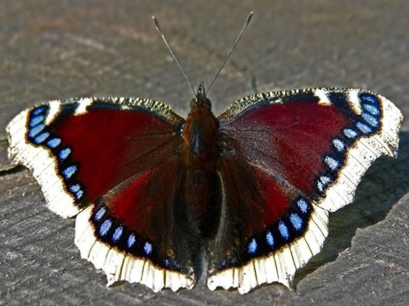 из-за смерти близкого человека. Несмотря на не очень веселое название, ничего печального в ней нет. Траурницу назвали потому, что крылья всех разновидностей этого насекомого окрашены в темные цвета. Траурницы – довольно крупные бабочки шоколадного или темно-вишневого цвета. По краям на крыльях есть бежевые полоски и синие пятнышки. Тельце бабочки овальной формы, коричневое, почти черное. На голове длинные усики, а под брюшком тонкие ноги. Бабочки траурницы любят слегка забродивший фруктовый сок, поэтому их можно увидеть на перезревших фруктах, упавших с деревьев.