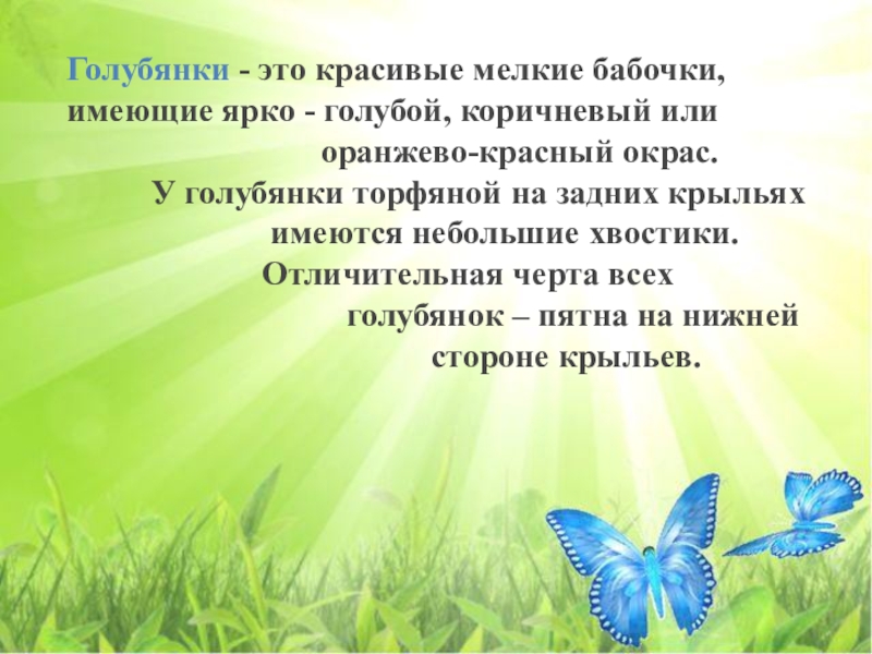 Слайд 23Голубянки - это красивые мелкие бабочки, имеющие ярко - голубой, коричневый