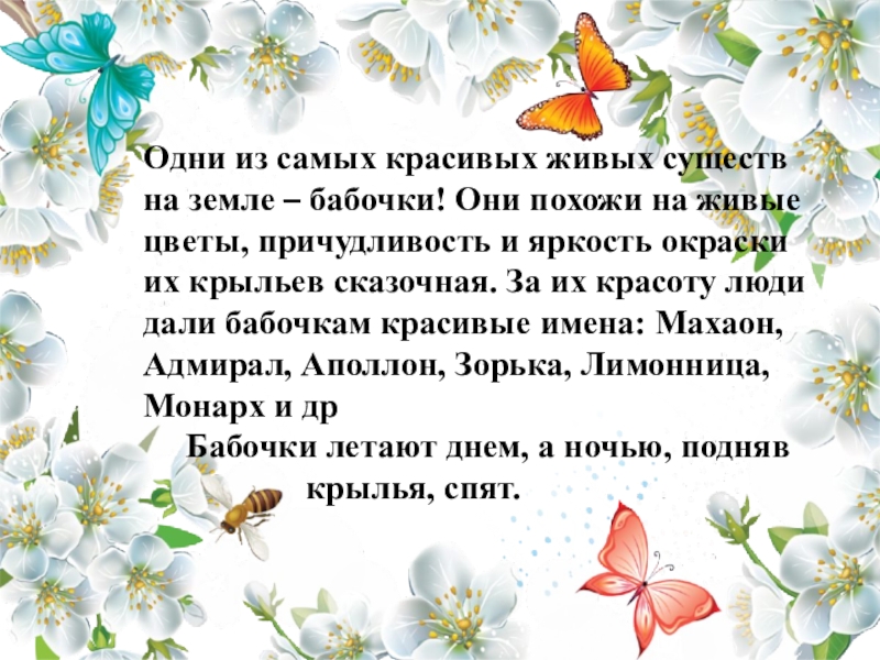 похожи на живые цветы, причудливость и яркость окраски их крыльев сказочная. За их красоту люди дали бабочкам красивые имена: Махаон,Адмирал, Аполлон, Зорька, Лимонница, Монарх и др