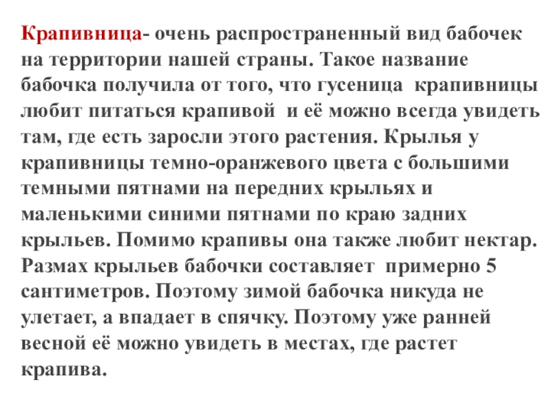 бабочка получила от того, что гусеница крапивницы любит питаться крапивой и её можно всегда увидеть там, где есть заросли этого растения. Крылья у крапивницы темно-оранжевого цвета с большими темными пятнами на передних крыльях и маленькими синими пятнами по краю задних крыльев. Помимо крапивы она также любит нектар. Размах крыльев бабочки составляет примерно 5 сантиметров. Поэтому зимой бабочка никуда не улетает, а впадает в спячку. Поэтому уже ранней весной её можно увидеть в местах, где растет крапива.