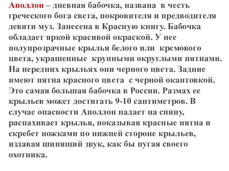 и предводителя девяти муз. Занесена в Красную книгу. Бабочка обладает яркой красивой окраской. У нее полупрозрачные крылья белого или кремового цвета, украшенные крупными округлыми пятнами. На передних крыльях они черного цвета. Задние имеют пятна красного цвета с черной окантовкой. Это самая большая бабочка в России. Размах ее крыльев может достигать 9-10 сантиметров. В случае опасности Аполлон падает на спину, распахивает крылья, показывая красные пятна и скребет ножками по нижней стороне крыльев, издавая шипящий звук, как бы пугая своего охотника.