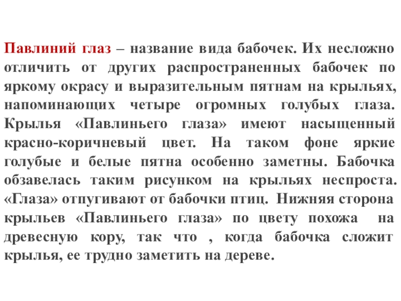 распространенных бабочек по яркому окрасу и выразительным пятнам на крыльях, напоминающих четыре огромных голубых глаза. Крылья «Павлиньего глаза» имеют насыщенный красно-коричневый цвет. На таком фоне яркие голубые и белые пятна особенно заметны. Бабочка обзавелась таким рисунком на крыльях неспроста. «Глаза» отпугивают от бабочки птиц. Нижняя сторона крыльев «Павлиньего глаза» по цвету похожа на древесную кору, так что , когда бабочка сложит крылья, ее трудно заметить на дереве.