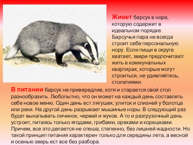 В питании барсук не привередлив, хотя и старается свой стол разнообразить. Любопытно, что он может на каждый день составлять себе новое меню. Один день ест лягушек, улиток и слизней у болотца или реки. На другой день разрывает мышиные норы. В следующий раз будет выкапывать личинок, червей и жуков. А то и разгрузочный день устроит, питаясь только ягодами, грибами, орехами и корешками. Причем, все это делается не спеша, степенно, без лишней жадности. Но такой принцип питания характерен только для середины лета, а весной и осенью зверь ест все без разбора.