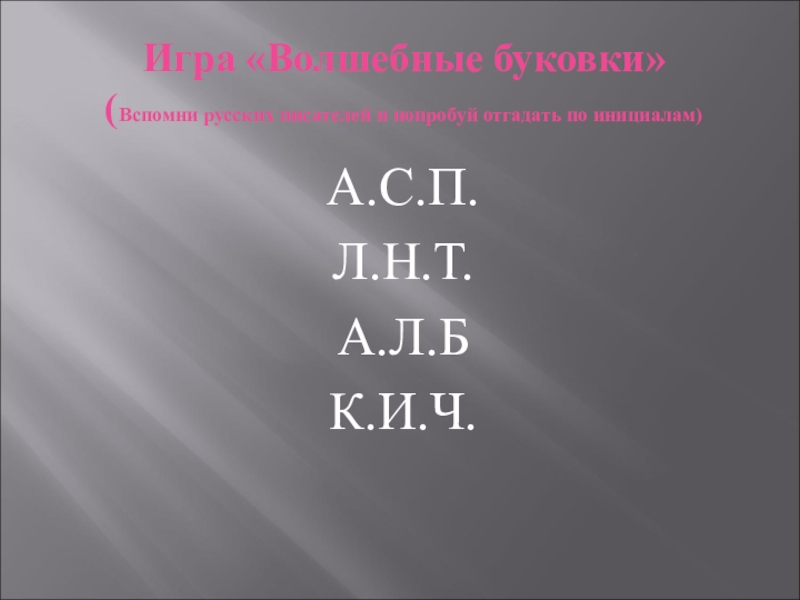 Игра «Волшебные буковки» (Вспомни русских писателей и попробуй отгадать по инициалам) А.С.П.Л.Н.Т.А.Л.БК.И.Ч.