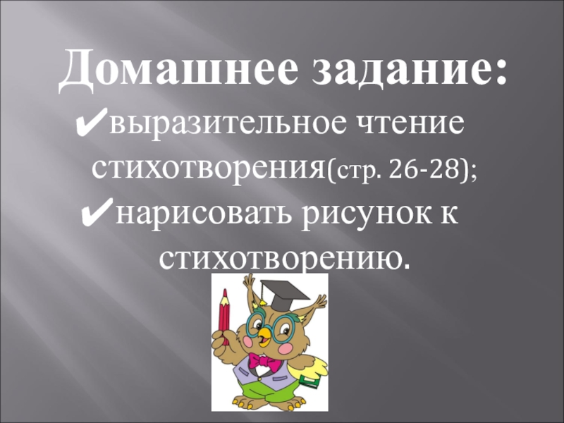 Домашнее задание:выразительное чтение стихотворения(стр. 26-28);нарисовать рисунок к стихотворению.