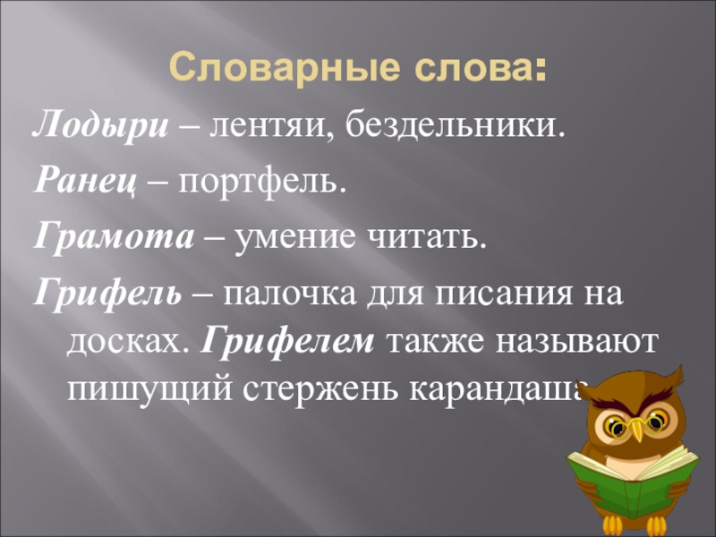 Словарные слова:Лодыри – лентяи, бездельники.Ранец – портфель.Грамота – умение читать.Грифель – палочка для писания на досках. Грифелем