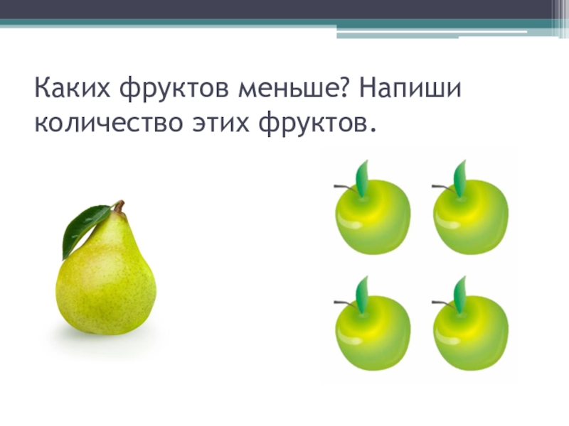 Слайд 4Каких фруктов меньше? Напиши количество этих фруктов.