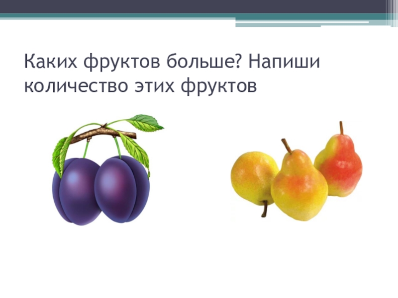 Слайд 3Каких фруктов больше? Напиши количество этих фруктов