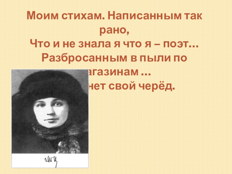 Моим стихам. Написанным так рано,Что и не знала я что я – поэт…Разбросанным в пыли по магазинам