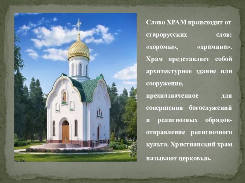 Слово ХРАМ происходит от старорусских слов: «хоромы», «храмина». Храм представляет собой архитектурное здание или сооружение, предназначенное для совершения богослужений и религиозных обрядов- отправление религиозного культа. Христианский храм называют церковью.