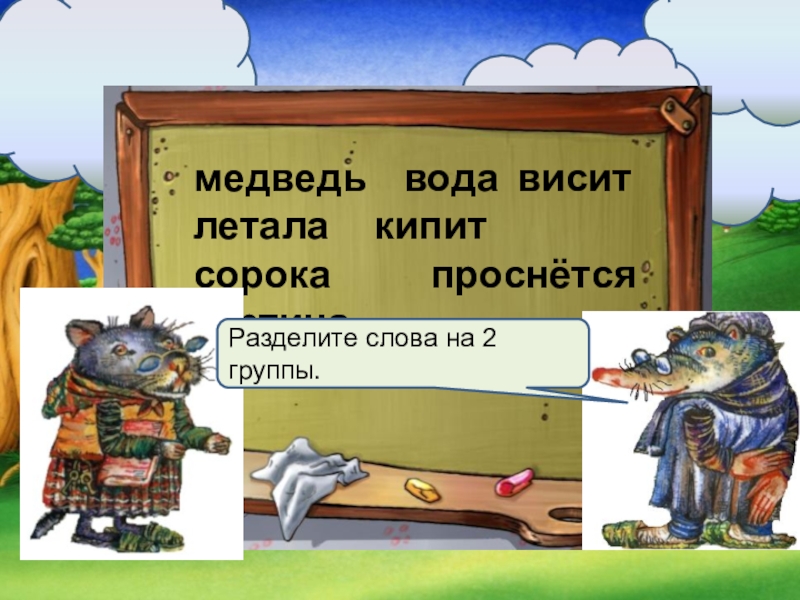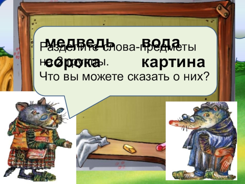Разделите слова-предметы на 2 группы. Что вы можете сказать о них?медведь    вода